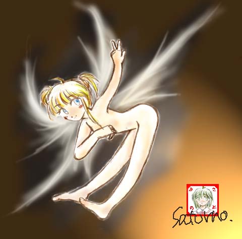 | NORY様の羽屋敷 20000アクセス記念 羽根娘ですぅ。おや、背景が別バージョンだ。ごめんなさい。 羽根を描いた後に、背景を黒くしないと見えないことに気付いた。もうどうしようって感じ。 | |