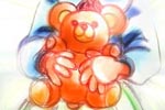 <99/11/07> T381さん、にぅカウンター999踏み踏み記念〜。 もえちんにくまのぬいぐるみをあげるリュー。 |